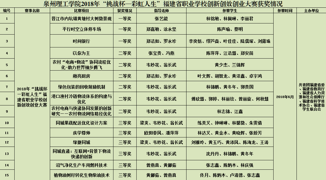 日前,由团省委、省教育厅、省人社厅、省科协、省学联主办,黎明大学承办的2018年“挑战杯—彩虹人生”福建省职业学校创新创效创业大赛落下帷幕。我校喜获佳绩,共荣获省一等奖3项、省二等奖6项、省三等奖6项,成绩在...