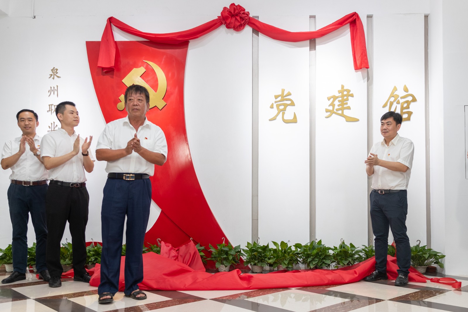 泉州市高教中心办主任陈志刚、副主任李冬英,内坑镇副镇长丁诗铃,学校董事长吴金营、党委书记傅志雄共同为党建馆揭牌。