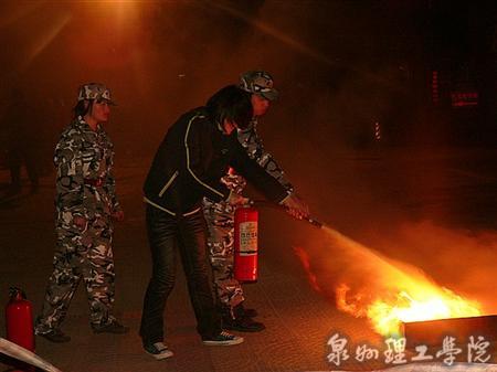 当晚应急疏散演练结束后,学校举行了消防演练。在消防大队和学校校卫队的指导下,宿舍寝室长学习如何用灭火器灭火。随后,该校学生还集体观看了安全教育片。