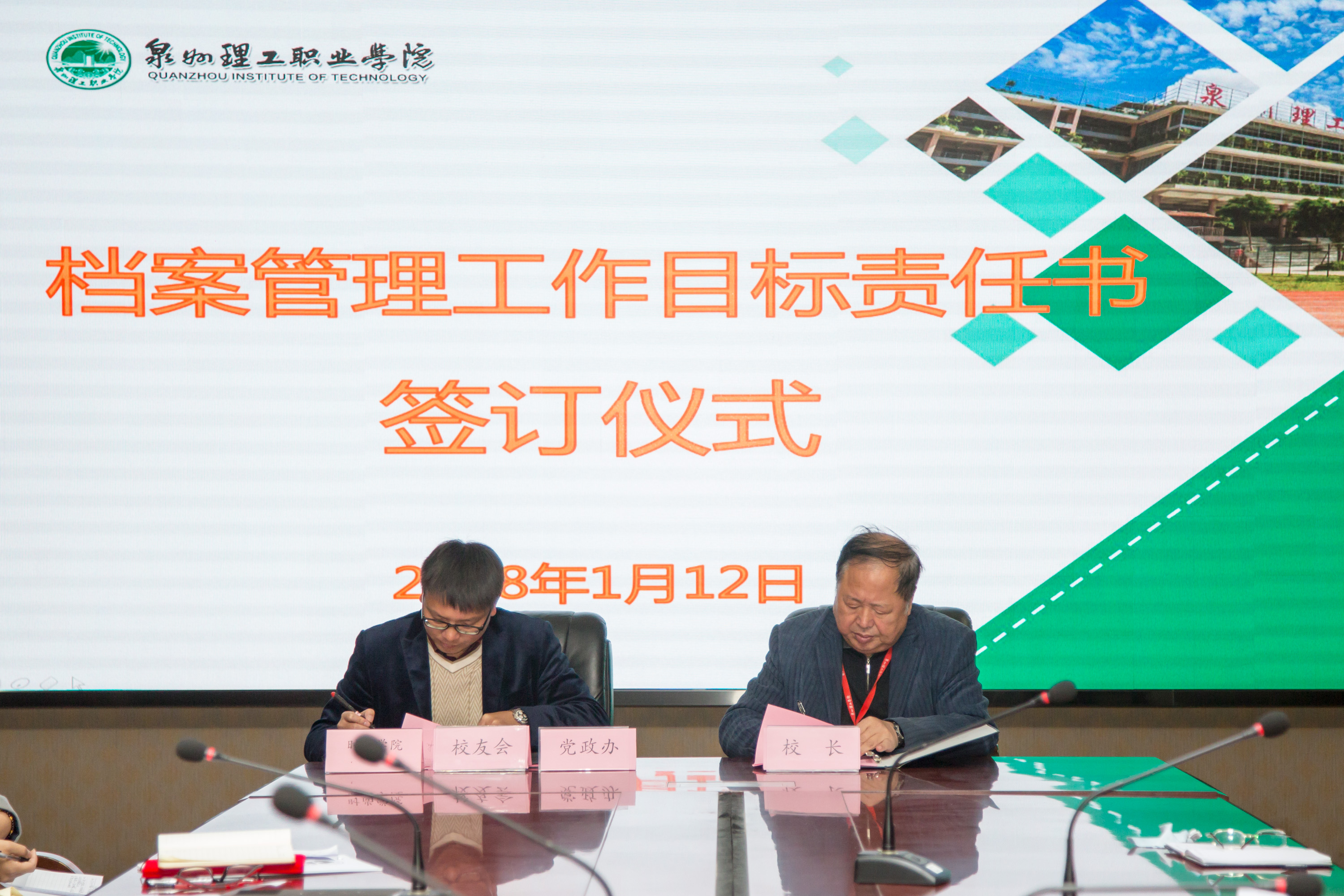 会议第三个议程签定《泉州理工学院档案管理工作目标责任书》为了建立一个与学校教学、科研、管理等工作相适应的门类齐全、结构合理、管理科学、服务有效的档案工作体系,根据《泉州理工学院档案管理办法》,制定本目标管理责任状,并共同遵守所签条款。