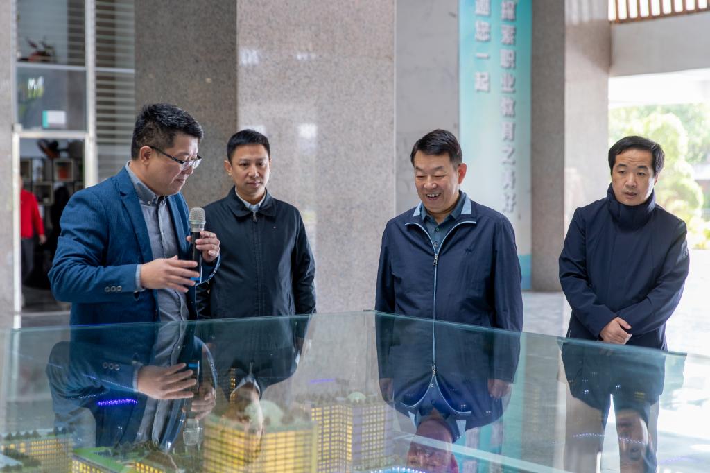 调研组一行先后考察了生态校园沙盘、艺术传媒学院、党建馆、国科数字产业学院,详细了解学校规划建设、绿色生态校园、办学情况、党建和思想政治工作,以及我校刚刚获批首批国家级市域产教联合体。张文栋充分肯定了吴金营董事长公益办学的家国情怀及我校“产业伙伴型大学”的办学特色。