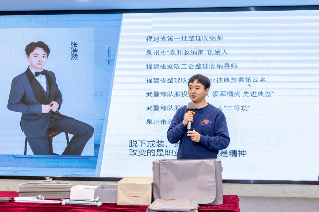 “这件衣服请一位老师上台来展示一下日常生活中是如何将它叠好的”,只见她轻车熟路地将衣服叠好,放置在桌面。“大家说这样的叠法对不对?没错,日常生活当中,大部分人的衣服都是这么叠的,随手一折,放进衣橱,然后要使用的时候,这一沓衣服就又散落下来了,今天我就教大家学习一些日常生活中的收纳小技巧”。
