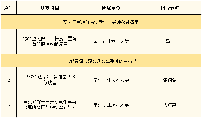 近日,福建省教育厅公布福建省大学生创新大赛(2024)获奖名单。泉州职业技术大学参赛团队在比赛中大放异彩,共获奖项12项,其中金奖3项、银奖2项、铜奖4项、优秀创新创业导师奖3项,实现获奖质量与获奖数量的双突破。