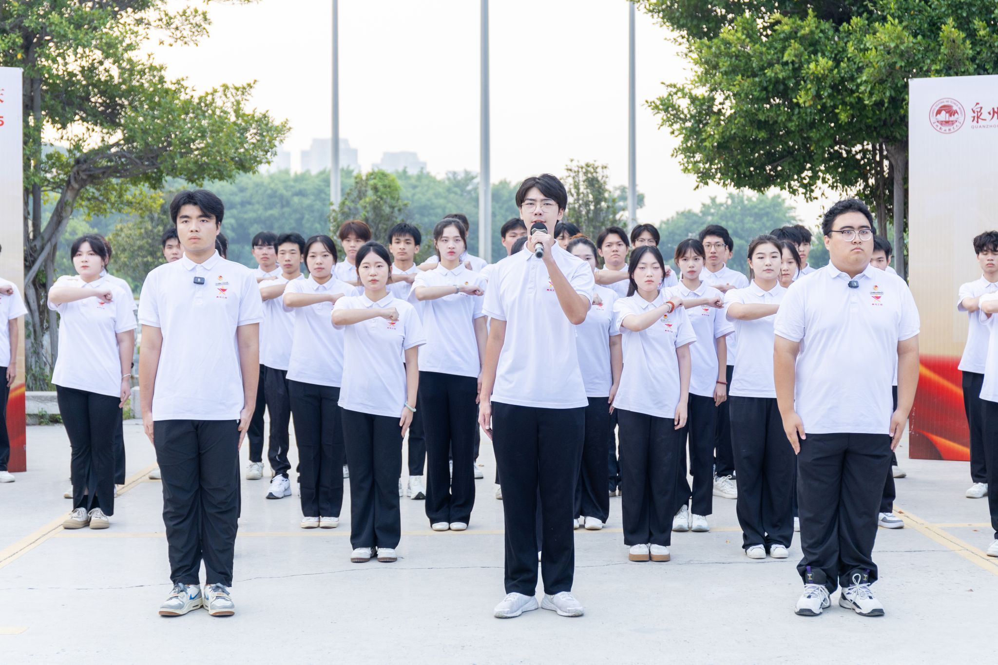 “80年前,中华儿女用忠诚与坚韧赢得民族独立;今天,泉大青年要以奋斗与担当续写复兴华章!”傅志雄在国旗下讲话,结合抗战精神与学校39年办学初心,向全体师生提出三点期许。
