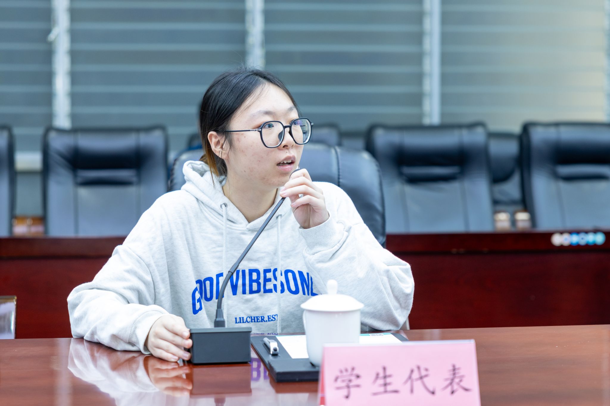 座谈会上,学生代表结合自身实习经历与职业发展规划积极发言,表达了对就业岗位和职业发展空间的期待。陈丽蓉与学生亲切交流,听取学生的想法和建议。