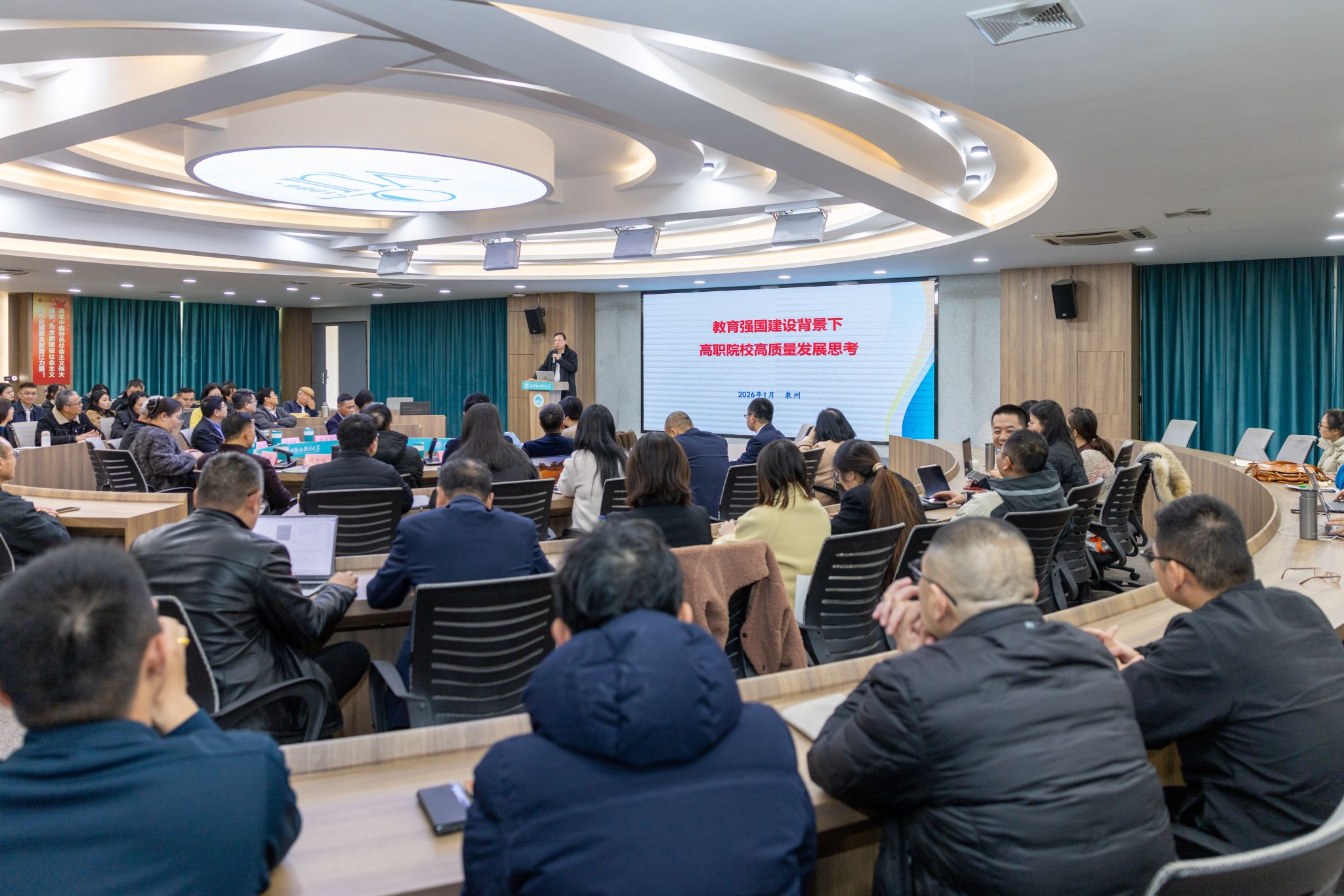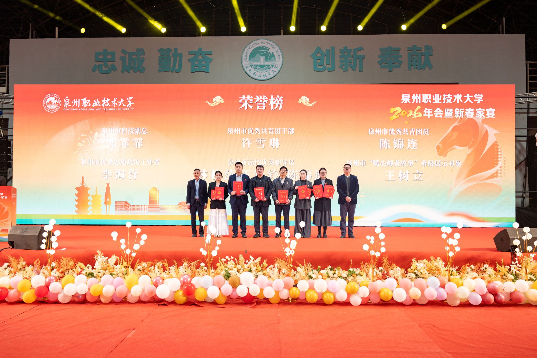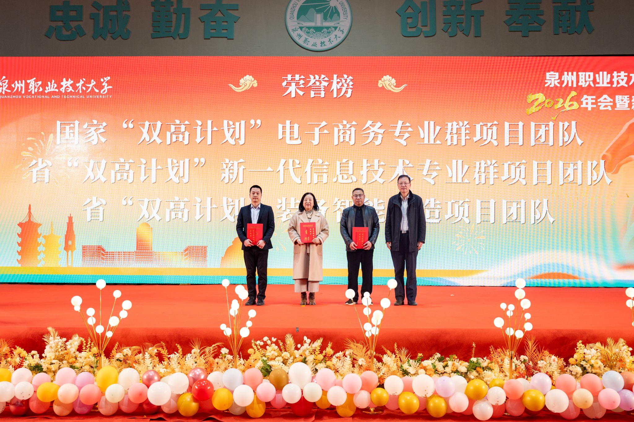 1月20日,泉州职业技术大学隆重举行2026年会。学校创办人、董事长吴金营,泉大教育基金会理事长杨培琛,校长吴滨如,党委书记傅志雄,全体校领导、教职工及产业伙伴代表、南非培训学员参加。年会由傅志雄书记主持。