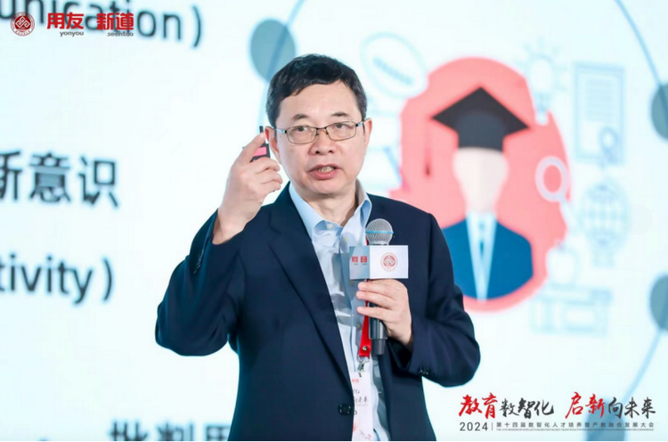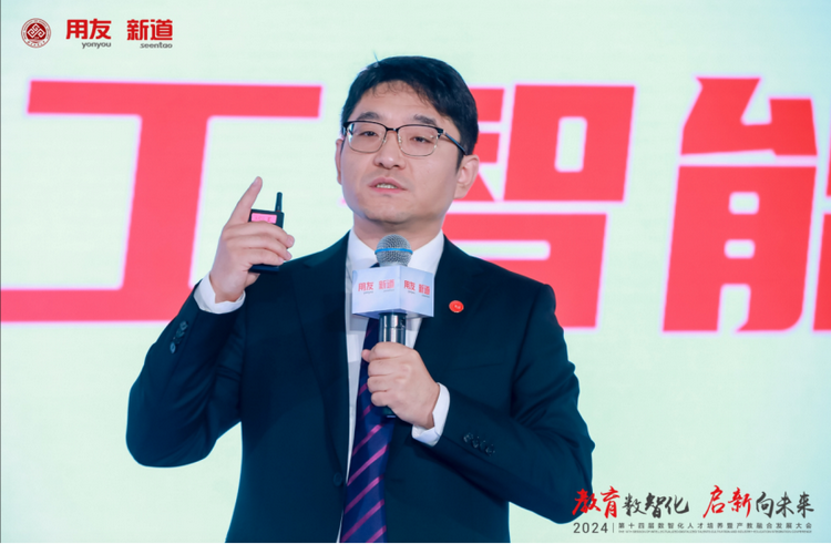 新道科技股份有限公司副总裁贾大明以“教育数智化 启新向未来—新质生产力时代下的产教融合新基建”为题作主题演讲。他表示,发展数字经济就是发展新质生产力,数智人才就是新质人才,新质人才特征是更懂硬科技、更懂数据、更懂产业,培养新质人才要围绕能力构建产教融合、运用科技构建产教融合。贾大明介绍,新道科技以产业态势感知平台,聚焦人才供需适配;以产业链认知平台,构建产业全局思维;以企业认知实践平台,构建企业全局思维;以商科专业创新平台,构建场景+、科技+、数据+;以工科专业创新平台,构建场景+、科技+、装备+;以跨专业综合实践平台,聚焦学科交叉综训;以能力训赛平台,聚焦能力鉴定与竞技;以数智科研平台,助力教师科研创新;以产教融合大脑,聚焦产教资源平衡。贾大明表示,新道科技是产教融合战略伙伴,能构建用友生态全流程、多形态的闭环合作;是产教融合最佳伙伴,通产业、懂教育、富科技、有情怀;是产教融合务实伙伴和未来伙伴,围绕人才培养的基本面开展落地行动。