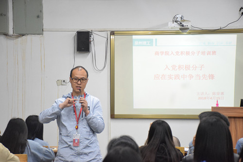 商学院党总支于2018年4月14日-2018年4月15日举办了入党积极分子培训班。出席本次培训班的老师有:商学院党总支书记陈荣惠老师,商学院党总支第一党支部书记游小玲老师,商学院党总支第二党支部书记罗永珍老师。参加此次培训班的入党积极分子共有85名,主要来自商学院16级、17级各专业的同学。
