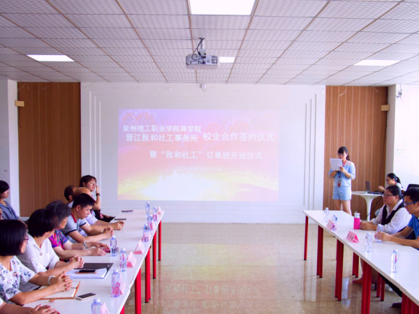此次签约仪式共分六项议程,泉州理工学院校长助理、校团委书记、招生就业处处长蔡金佩老师致辞、晋江致和社工事务所夏晋城理事长做重要讲话、晋江致和社工事务所夏晋城理事长与泉州理工学院商学院院长翁长武教授进行校企合作共建单位签约、商学院院长翁长武教授为“致和社工”订单班做动员讲话、致和社工事务所代表讲话、致和社工订单班的学生代表发言、致和社工订单班岗前培训。此次校企合作签约、订单班开班仪式,旨在进一步开展社工服务的校企合作共建,培养具有高度社会责任感,乐于奉献的高素质人才,达到校企共赢的良性循环。此次签约后,马上进行订单班的开班和岗前培训,让订单班的同学能及时学以致用,直接上岗。同时致和社工事务所,也成为本次商学院跟岗实训22个订单班之一。