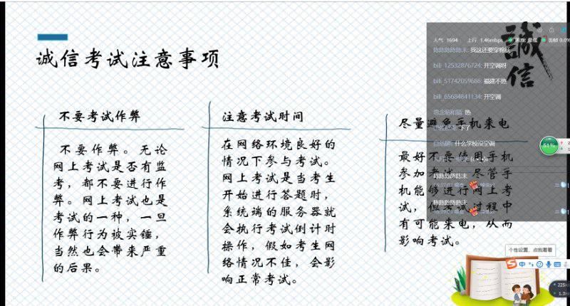 6月2日下午,由财经学院学业辅导员徐燕琴老师组织,在线上举行“期末线上诚信考试及注意事项”会议,主要讲期末线上诚信考试和考试时间安排,与许久不见的同学们聊聊天,疏导同学们期末考试焦虑,合理复习。了解他们的近况,并针对考试期间考试所用软件会发生的突发情况我们做出解决方案。
